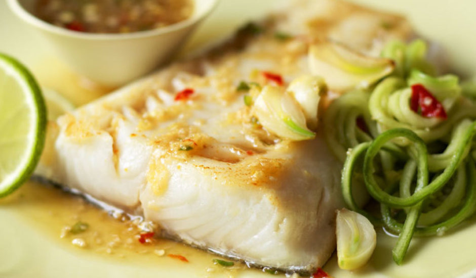 Pan-fried Alaska sablefish paired with a bright ginger-lime sauce and cucumber noodles makes for a fresh spring dish.