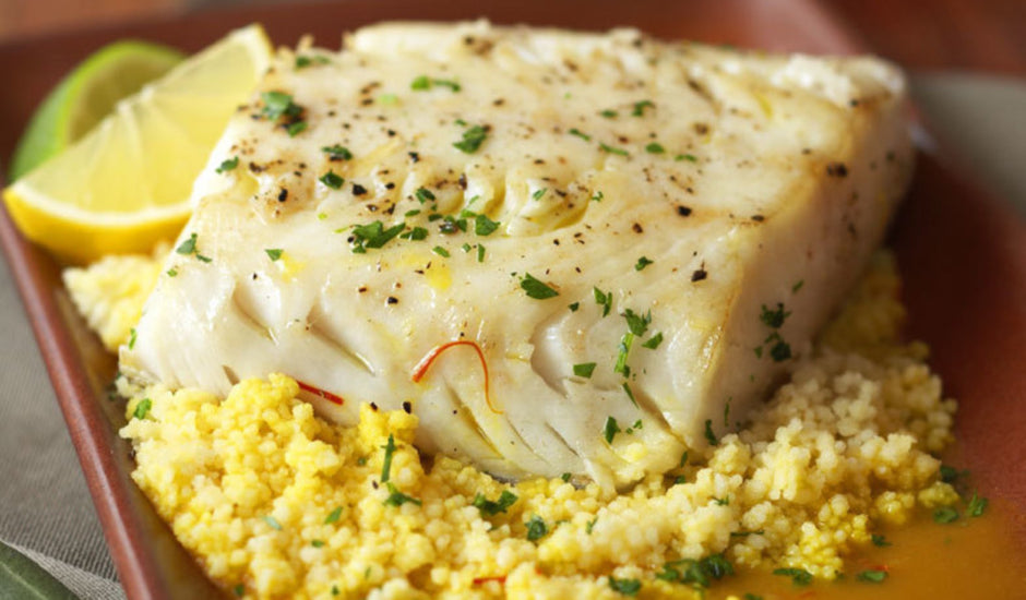 Olive Oil Poached Alaska Sablefish with Couscous and Saffron Broth